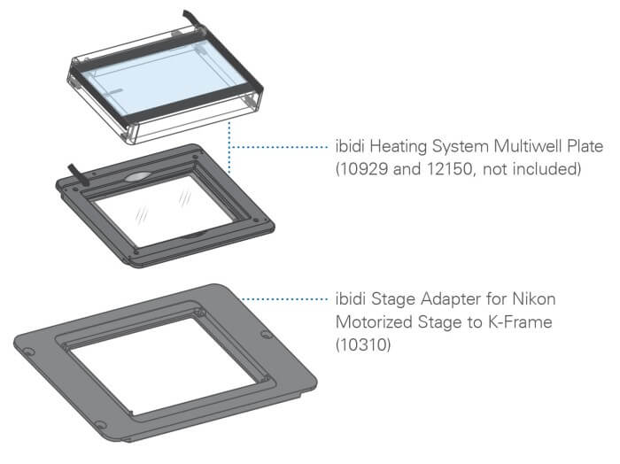 • 貨號10310:此組裝套件包含ibidi載物臺適配器(用于Nikon電動載物臺轉接至K-Frame)、以及用于將其組裝到 ibidi多孔板加熱系統(貨號:12150)加熱板上的快速安裝說明和螺絲(加熱系統本身不包含在內)