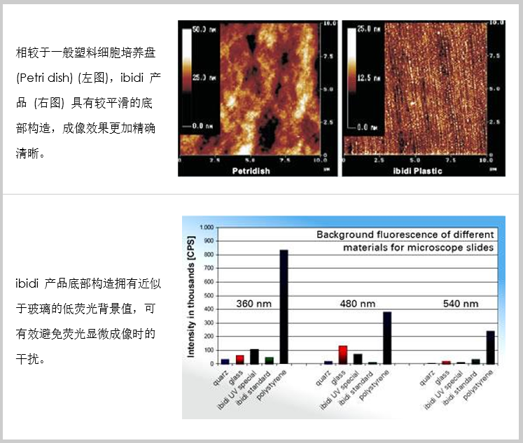由德國 ibidi 公司所研發(fā)的 µ-Slide 與 µ-Dish 系列產(chǎn)品,與一般市面上常見的細胞培養(yǎng)器皿不同,其底部是由獨特的塑料所制造,具有可比擬玻璃材質的高光學穿透與低熒光背景值特性,因此除了可適用于細胞培養(yǎng)以外,還可在顯微鏡下呈現(xiàn)出非常清晰漂亮的細胞影像。